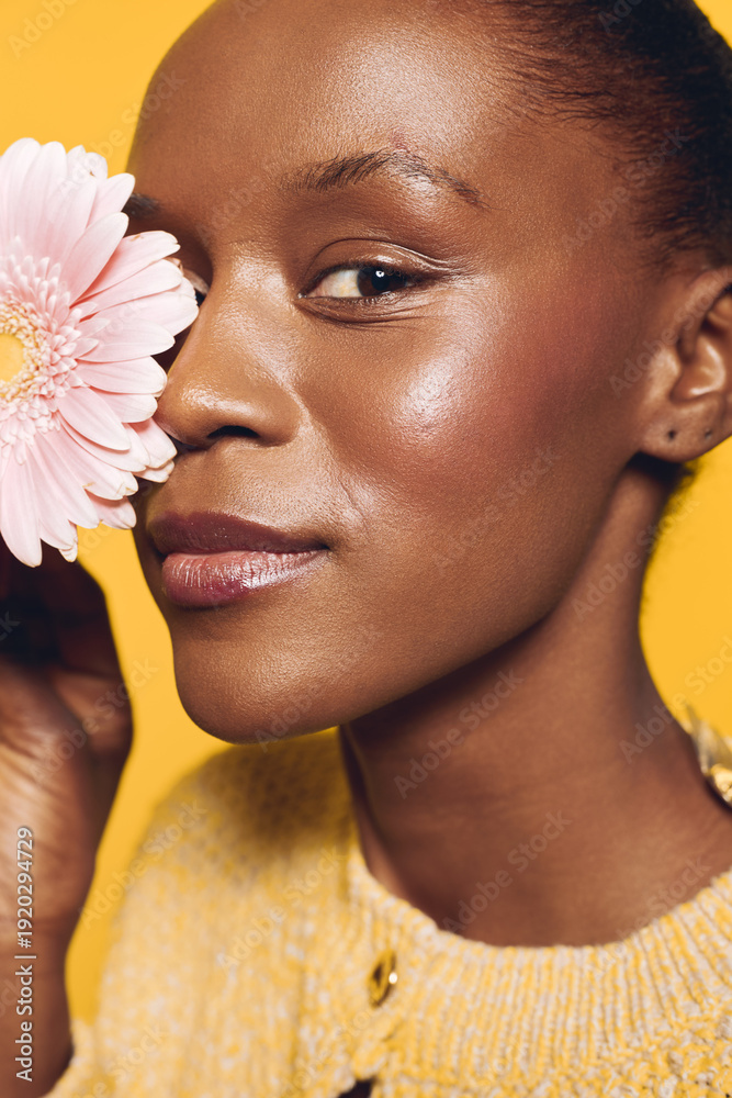 Obraz na płótnie Canvas - Close-up of a smiling black woman with dark skin holding a pink flower near her face. Yellow background and soft lighting emphasize natural beauty and skincare concept..