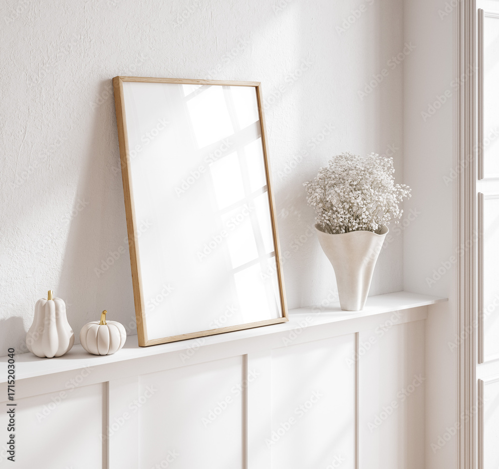 Obraz na płótnie Canvas - Mock up frame in home interior background, white room with dry flowers and pupkin decoration, Scandi-Boho style, 3d render.