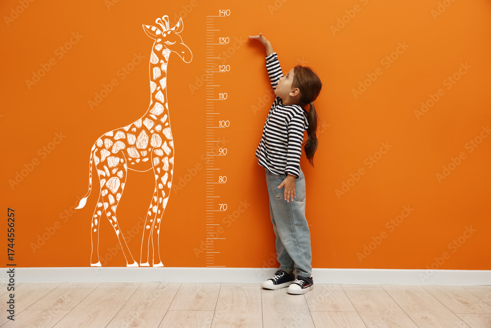 Obraz na płótnie Canvas - Cute little girl measuring her height near orange wall with scale and drawing of giraffe.