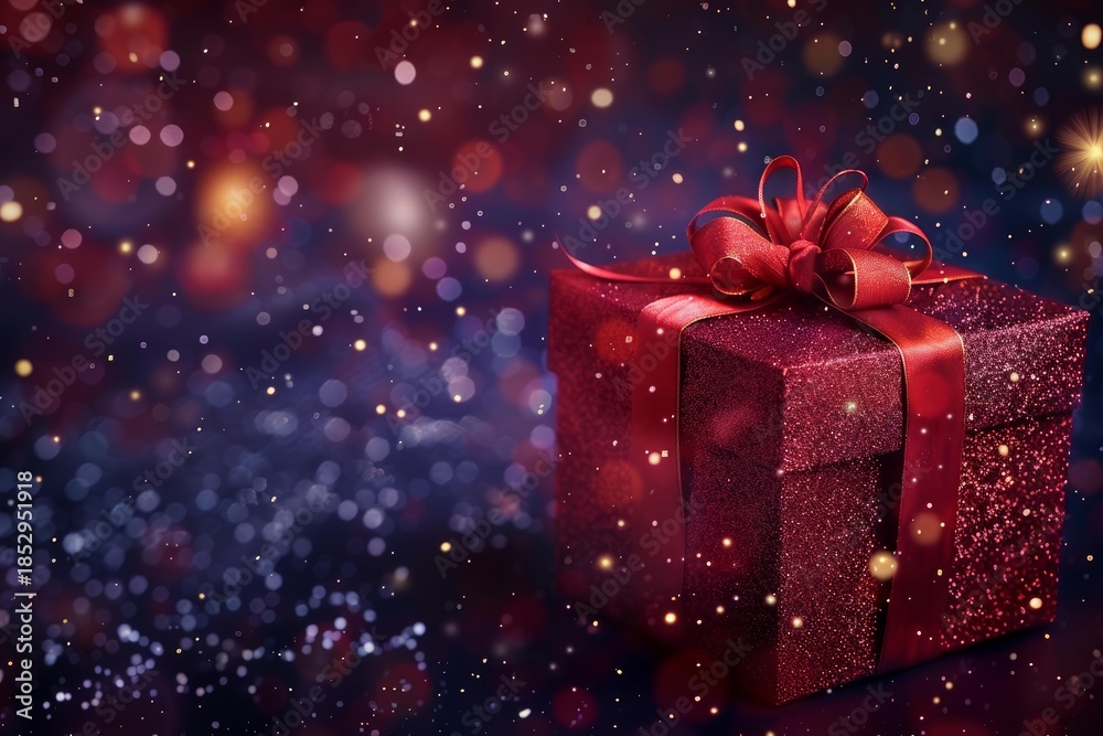 Plakat - Elegant red gift box with a sparkling ribbon, set against a backdrop of festive bokeh lights, creating a magical christmas atmosphere.