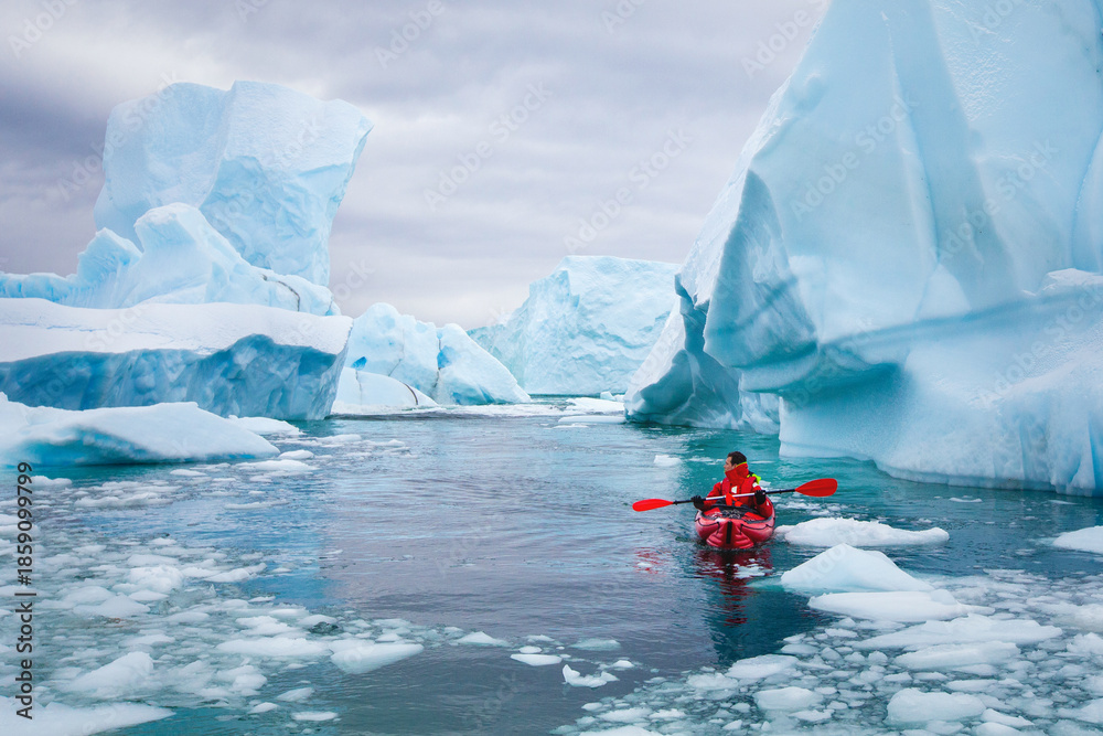 Plakat - kayaking in Antarctica, man paddling on kayak between icebergs and ice, adventure expedition travel.