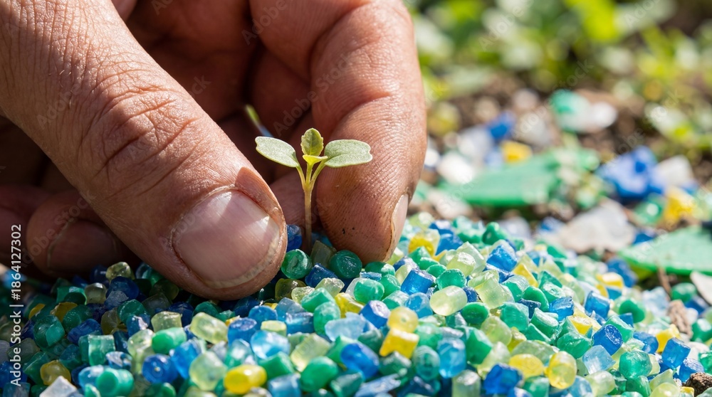 Plakat - A seed of hope sprouts from a pile of colorful recycled plastic fragments, representing the potential for environmental sustainability and a circular economy. A hand gently nurtures the tiny seedling..
