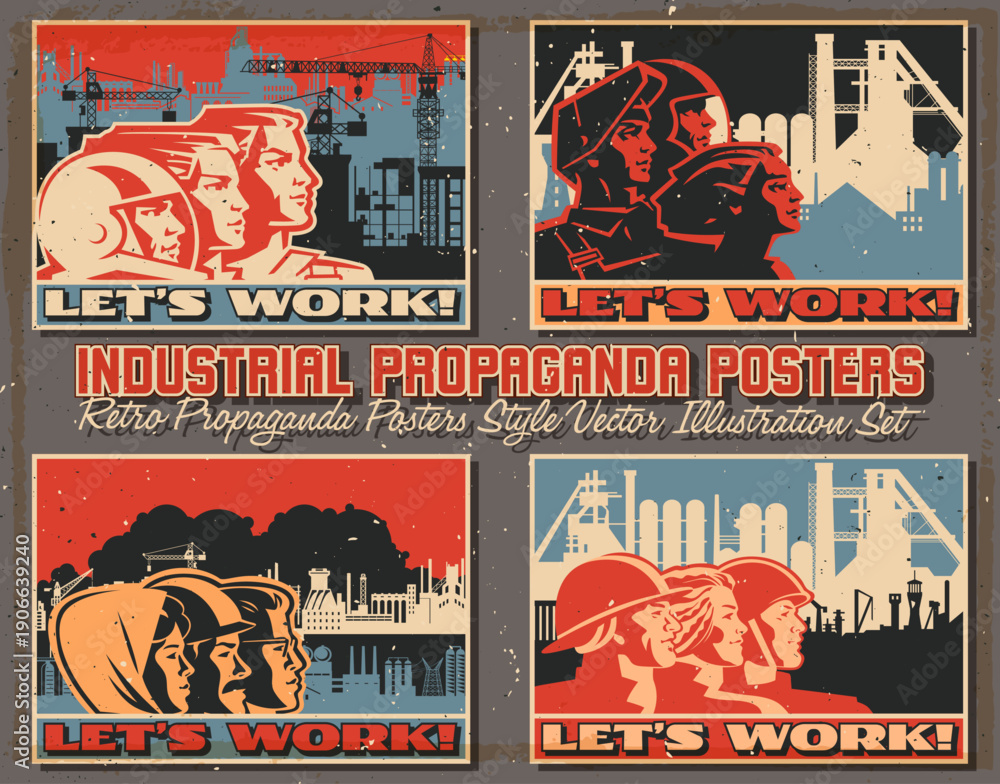 Plakat - Industrial Propaganda Posters. Retro Working Propaganda Placards Style Vector Illustration Set. Working People, Factory, Plant, Construction Site. Vintage Placards Style Vector Illustrations.