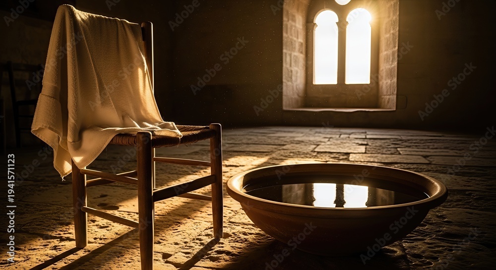 Plakat - Maundy Thursday, solemn feet washing ritual, symbolic act of humility, Jesus Christ's servant leadership, sacred spiritual tradition, ancient room, holy reflection, spiritual devotion.