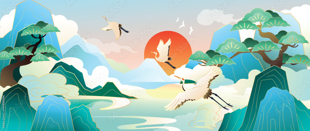 Plakat - Crane and mountain oriental landscape vector. Sunrise, pine trees and flying birds in elegant Asian nature background for banner, wall art, packaging and digital media..
