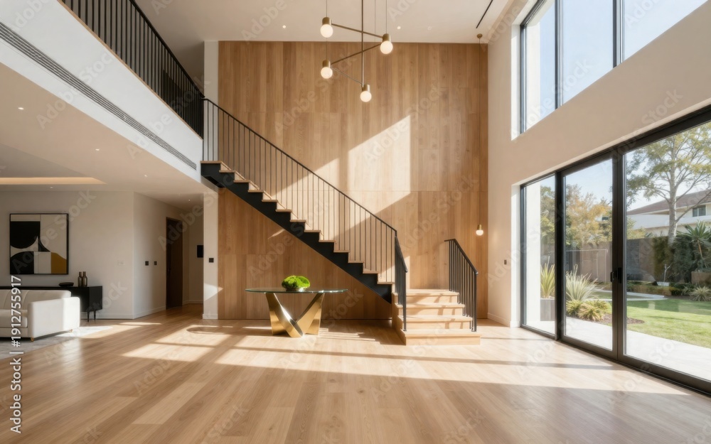 Plakat - Modern Home Interior with Open Staircase and Natural Light, Featuring Contemporary Design Elements.