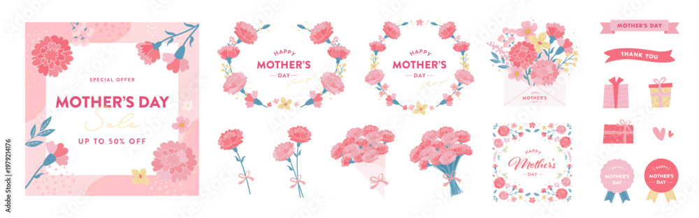 Plakat - 母の日のカーネーション装飾セット フレームとラベルのベクターイラスト.