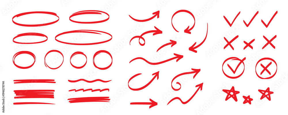>Plakaty>Wybrane motywy - zobacz więcej !>Taniec>Hand drawn pen line highlight red set. Line red hand drawn pen marker stroke underline, arrow, check mark emphasis. Round oval, circle scribble frame, arrow elements . Vector illustration