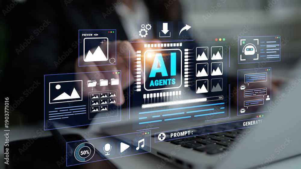 Plakat - Close-Up of Business Person Interacting with Futuristic Digital AI Interface on Laptop Screen for Technology Concept in Modern Workplace Quark..