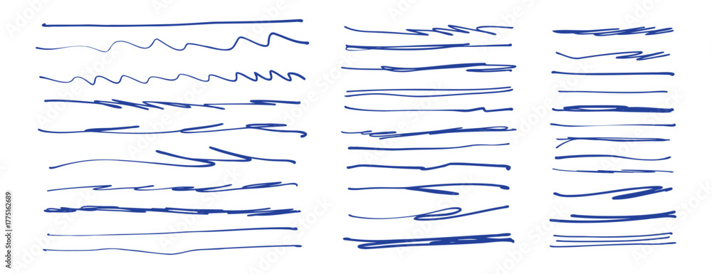 Plakat - Hand drawn blue pen underline strokes. freehand pen stroke sketch brush scribbles, ink marker squiggle lines..