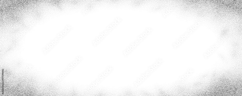 Plakat - Stippled sand grain gradient texture. Fading sprayed dot frame background. Grunge dotted noise pattern wallpaper with zoom effect. Radial border overlay. Vector vignette grainy halfton patern backdrop.