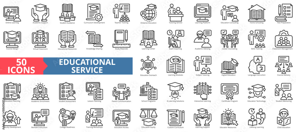 >Plakaty>Wybrane motywy - zobacz więcej !>Tramwaj>educational service icon set outline style illustration. containing home schooling, test preparation, course design, language instruction, parent communication, child education, college readiness