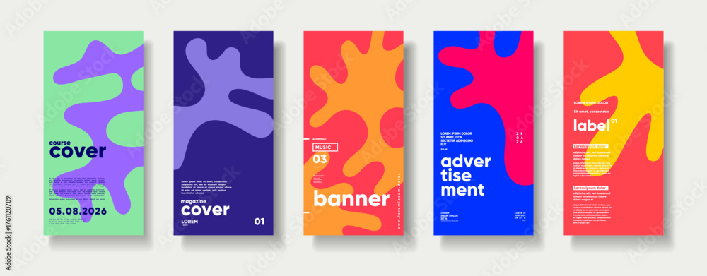 Plakat - A vibrant collection of abstract poster designs featuring bold colors and organic shapes. Each poster showcases unique layouts suitable for courses, magazines, banners, advertisements, and labels..