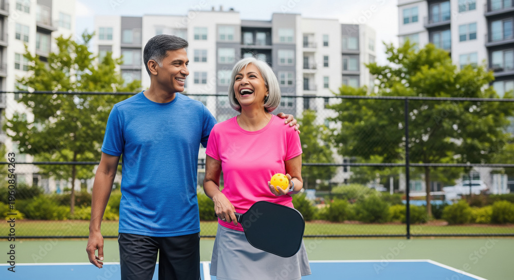 Plakat - A happy senior couple enjoying an active game together on a sports court, promoting fitness and companionship..