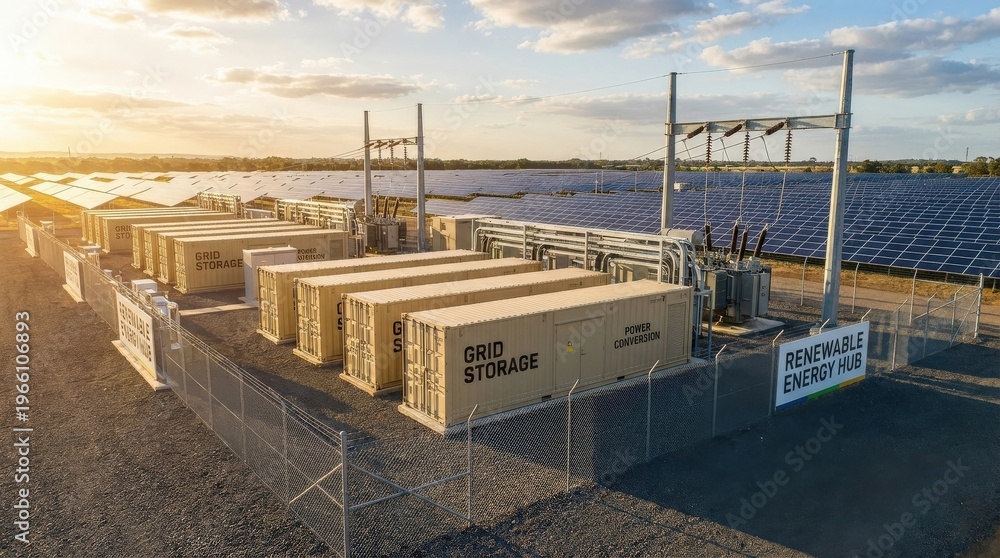 Plakat - A grid-scale energy storage system positioned adjacent to a photovoltaic solar farm, large battery container units with power conversion hardware arranged in a fenced compound, solar panels visible in.