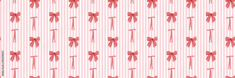 >Plakaty>Wybrane motywy - zobacz więcej !>Warszawa>Seamless pattern featuring red ribbon bows on soft pink vertical stripes. Cute feminine design perfect for packaging, textiles, stationery, and Valentine’s themes