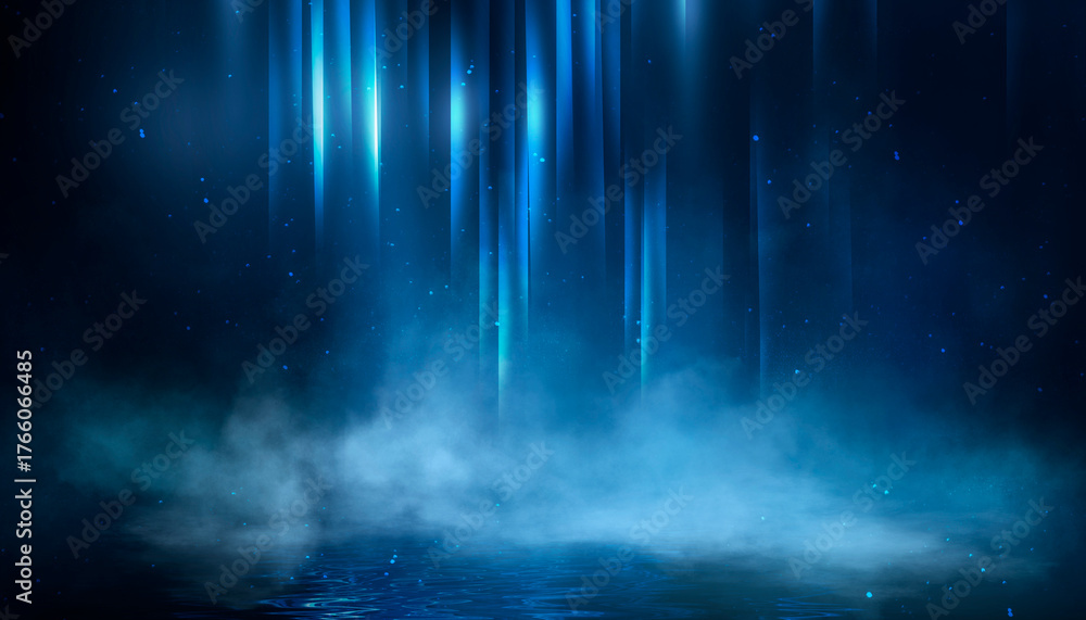 Plakat - Dark street, asphalt abstract dark blue background, empty dark scene, neon light, spotlights The concrete floor and studio room with smoke float up the interior texture for display products.