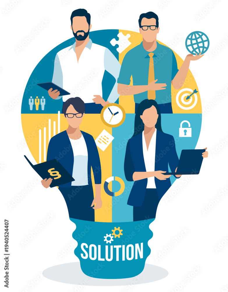 Plakat - Solution. Idea. Team shown in a silhouette in the shape of a light bulb. Business vector illustration. .