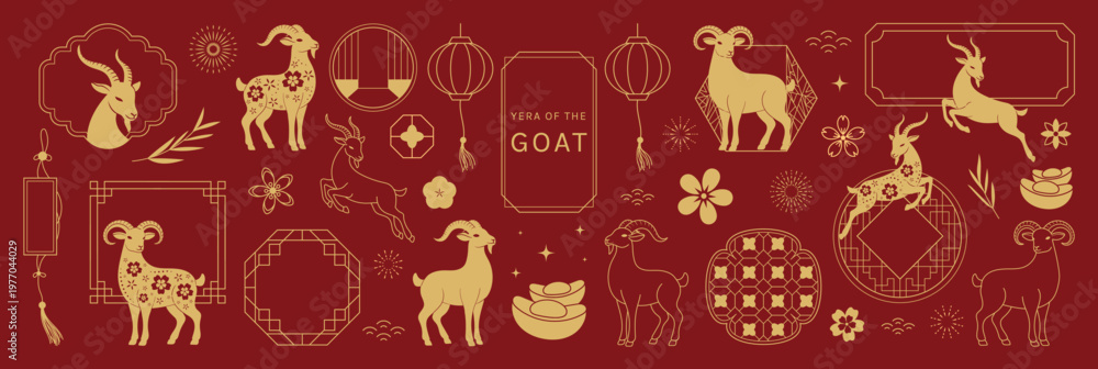 Plakat - Happy Chinese New Year 2027 goat vector set. Red and gold zodiac animal collection with ornamental frames, lantern, flowers, firecrackers and festive Chinese decorative elements..