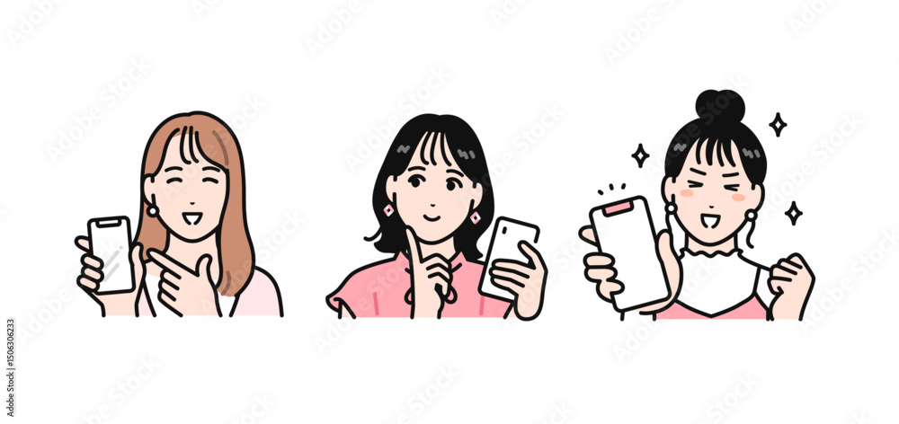 Plakat - スマートフォンを見て喜ぶ3人の若い女性のシンプルなベクターイラストセット.