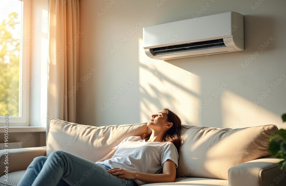 >Plakaty>Wybrane motywy - zobacz więcej !>Woda>Woman relaxes on sofa near window. Air conditioner cools room on hot summer day. Sunlight streams through curtains, creating shadows on wall. She enjoys fresh cool air.