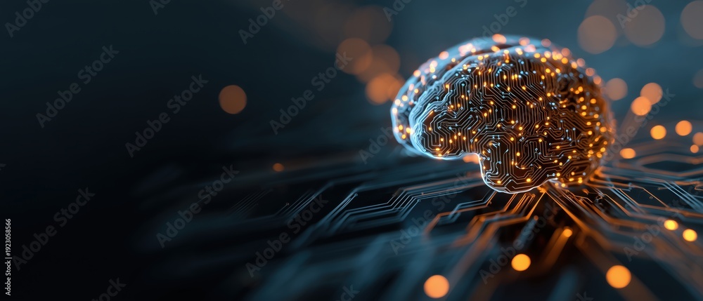 Plakat - abstract digital brain on a circuit board background with copy space, in blue and orange colors concept of artificial intelligence or technology for web banner design Generative AI.