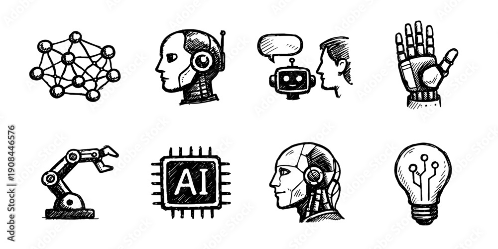 Plakat - AI communication sketch icon collection in black. Set of humanoid head, chatbot, robot assistant and human interaction icons in doodle style.