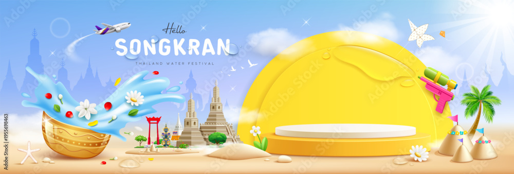 Plakat - Songkran water festival thailand, yellow podium display, Thailand tourism architecture, flowers in a water bowl water splashing, coconut tree, pile of sand and sand beach light blue background.