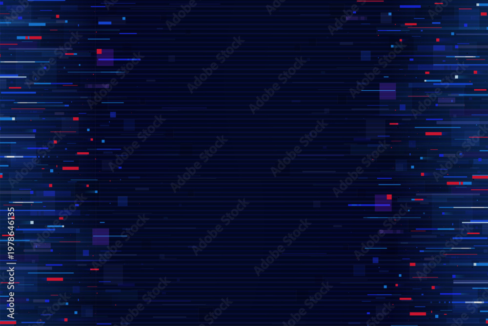 Plakat - Pixel glitch effect on noise screen background. Abstract digital backdrop with horizontal blue and red distortion lines. Vector dynamic cyber technology futuristic screen interference or motion effect.