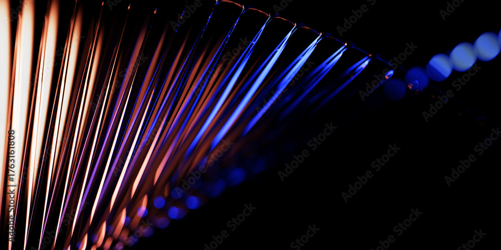 Plakat - Neon ribbed fractal glass 3d background with blur and bokeh effect. Holographic wave line pattern with gold blue purple gradient texture. Abstract black glitch bg in radiant colors. 3D illustration.