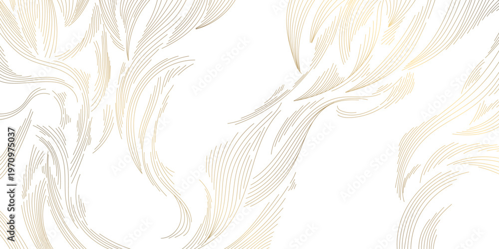 >Plakaty>Wybrane motywy - zobacz więcej !>Zachód słońca>Modern abstract wave oriental pattern, flowing golden lines on white background, Japanese and Chinese design. Elegant vector illustration, clouds, water flow. Luxury packaging, interior design.