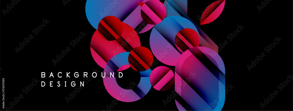 Plakat - Abstract geometric shapes overlap, creating vibrant color gradients. Design features blue, pink, red hues on black backdrop. Modern aesthetic..