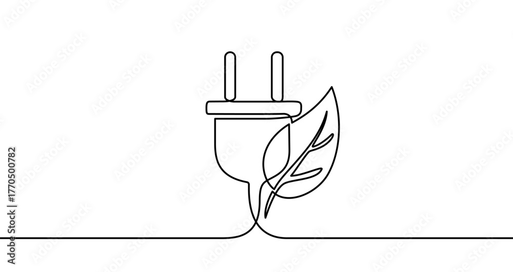 Plakat - Electric plug with a leaf in one line art style. Drawing of eco energy with editable black stroke on a white background. Vector illustration..