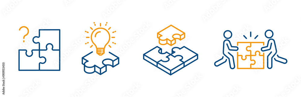 Plakat - puzzle icons, icon set of question mark puzzle, jigsaw solution, enterprise communication, jigsaw part, line art vector.