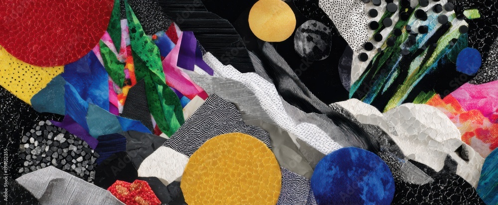 Plakat - Vibrant collage mosaic artwork evokes emotions with diverse fabrics and bold abstract elements..