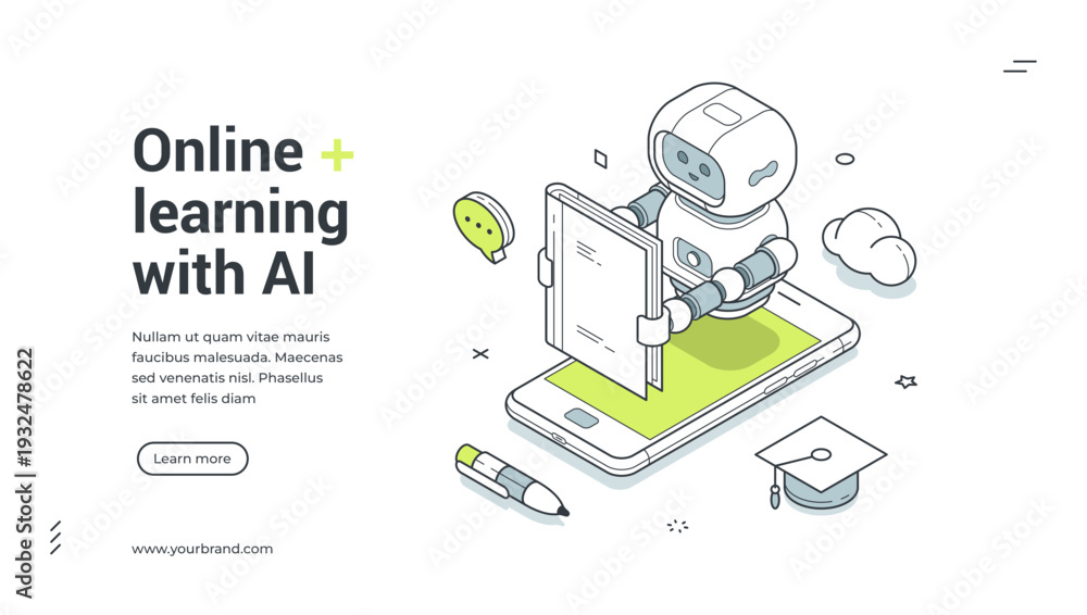 Plakat - Online learning with AI isometric banner. Robot for digital education and mobile e-learning. Modern web template vector illustration for a landing page and educational service.