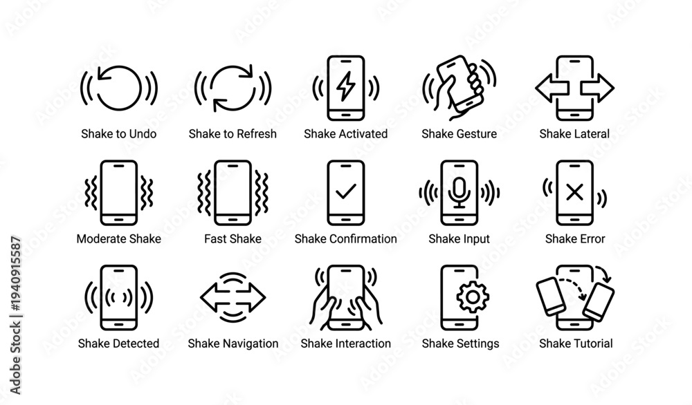 Plakat - Collection of 15 smartphone shake icon designs with various functionalities.