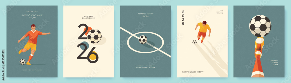 Plakat - Football posters set with soccer players and ball in retro flat style, sport championship banners collection, 2026 season concept vector illustration.