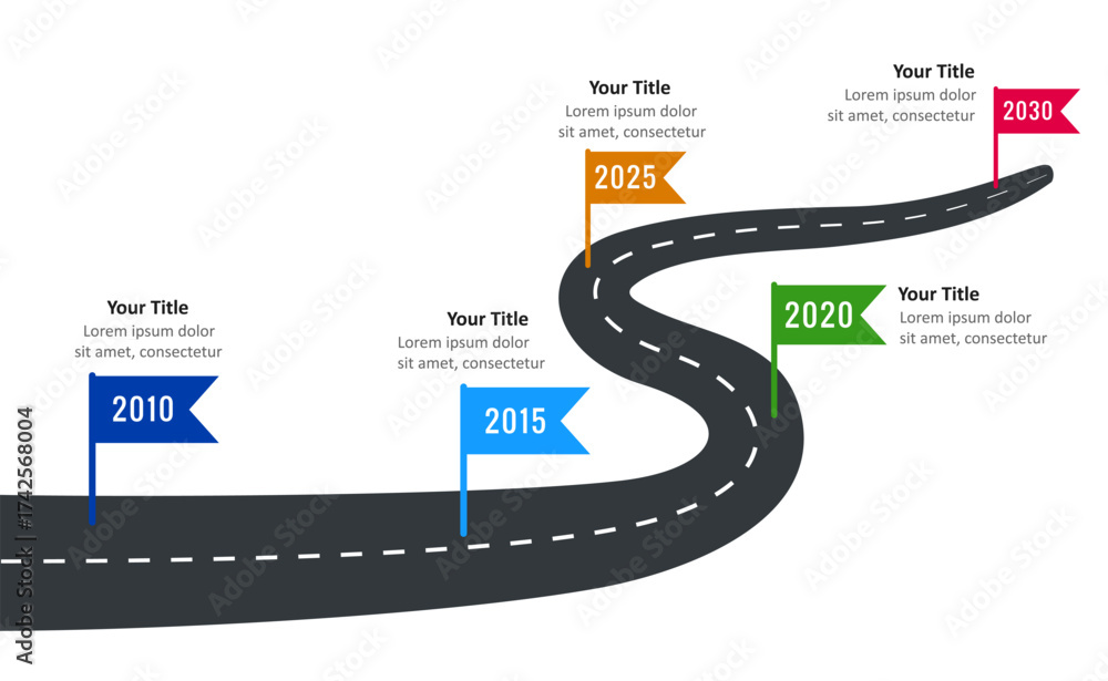 >Plakaty>Wybrane motywy - zobacz więcej !>Zielony>Timeline roadmap illustration on winding road, year markers on a roadway path for achievement goals, representation of progress, success visualization, project planning