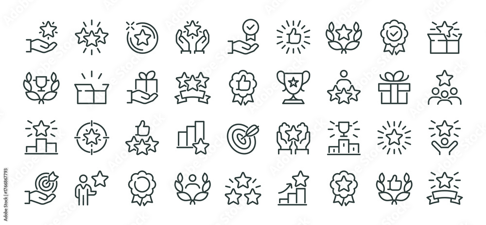 >Plakaty>Wybrane motywy - zobacz więcej !>Zielony>Exclusive Benefit, Special Offer, Best Award, High Rank Premium Icons Pack. Such Line Signs as Champion Cup, Stars, Medal. Vector Icons Set for Web and App in Outline Style Editable Stroke.