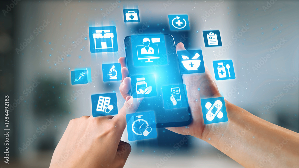 Plakat - Online pharmacy icons showing medicine, healthcare, prescription and medical services with digital pharmacy, online drugstore, telemedicine and modern pharmaceutical solutions. Gist.