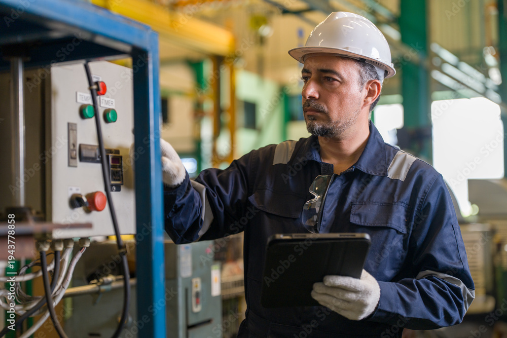 >Plakaty>Wybrane motywy - zobacz więcej !>Zielony>Male industrial engineer holding digital tablet while operating control panel switch in manufacturing factory plant. Professional technician checking machinery system maintenance process
