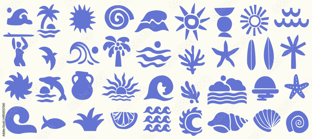 Plakat - Boho summer set. Naive spiritual geometric palm tree, sun, sea, waves and corals emblem. Tropical retro surf prints, summer beach label, naive vignetting silhouette. Hand drawn vector illustration..