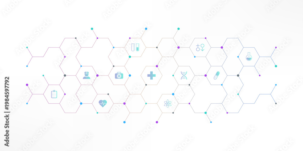 Plakat - Medical background and healthcare technology with flat icons and symbols. Concept and idea for health care business, innovation medicine, health safety, science, medical research, and development..