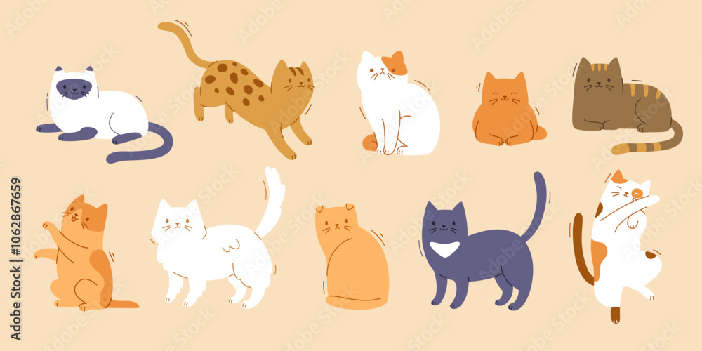 Plakat - Cute different home cat set. Vector flat pets poses collection. Cartoon cat breeds bundle..