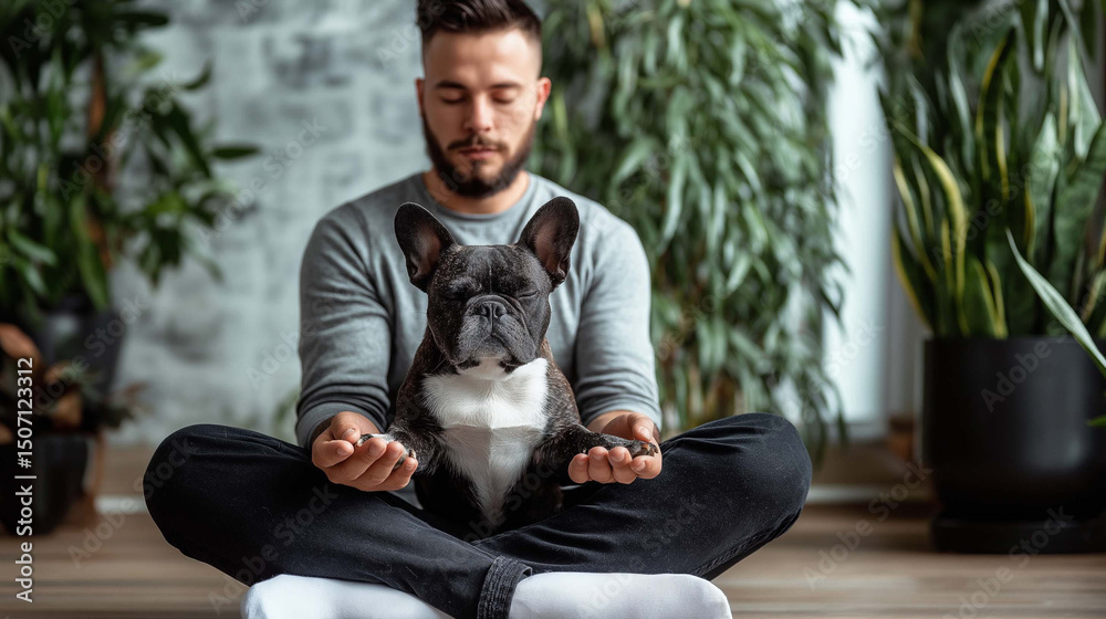 >Plakaty>Wybrane motywy - zobacz więcej !>Zwierzęta>Man meditating with his French bulldog, showing pet companionship, mindfulness, and mental wellness in a peaceful indoor setting with plants and calm atmosphere.