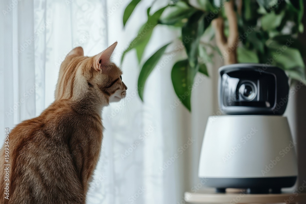 Plakat - Home indoor IP wireless CCTV camera on cat tower for pet security Selective focus.