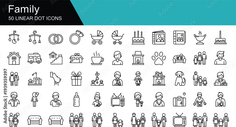 Plakat - Comprehensive collection of fifty linear dot icons representing family life, including parents, children, home activities, pets, celebrations, and daily household objects. (22 words).