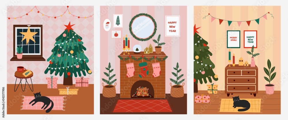 Plakat - Set of Christmas posters with decorated home interior. Cozy winter holiday rooms in flat cartoon style. Vector New Year festive card..