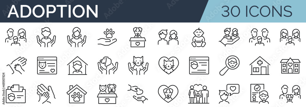 Plakat - Set of 30 outline icons related to child and pet adoption. Linear icon collection. Editable stroke. Vector illustration.